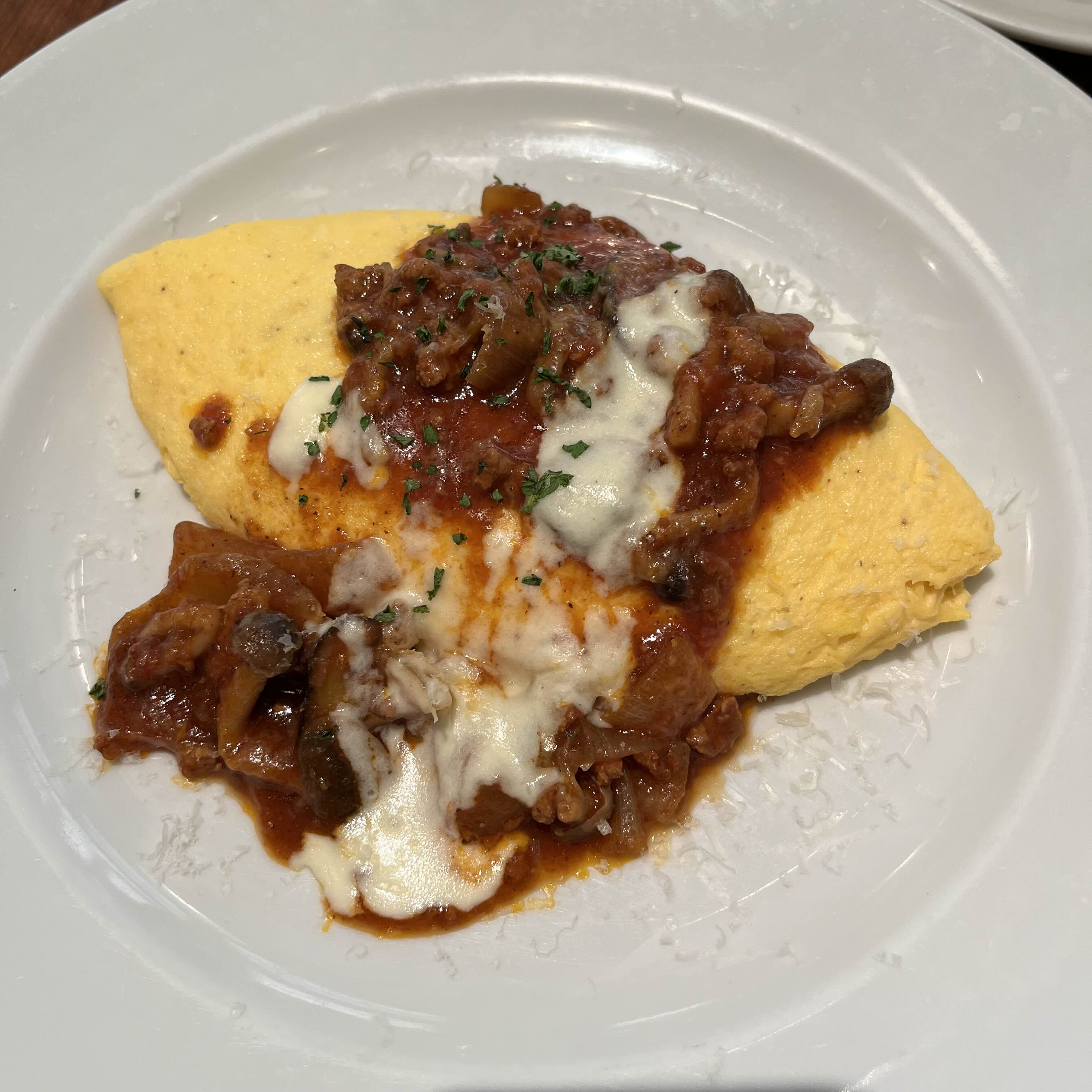 정말 예쁘게 만들어진 오믈렛이 버섯과 고기 소스가 올라간 채로 나온다.