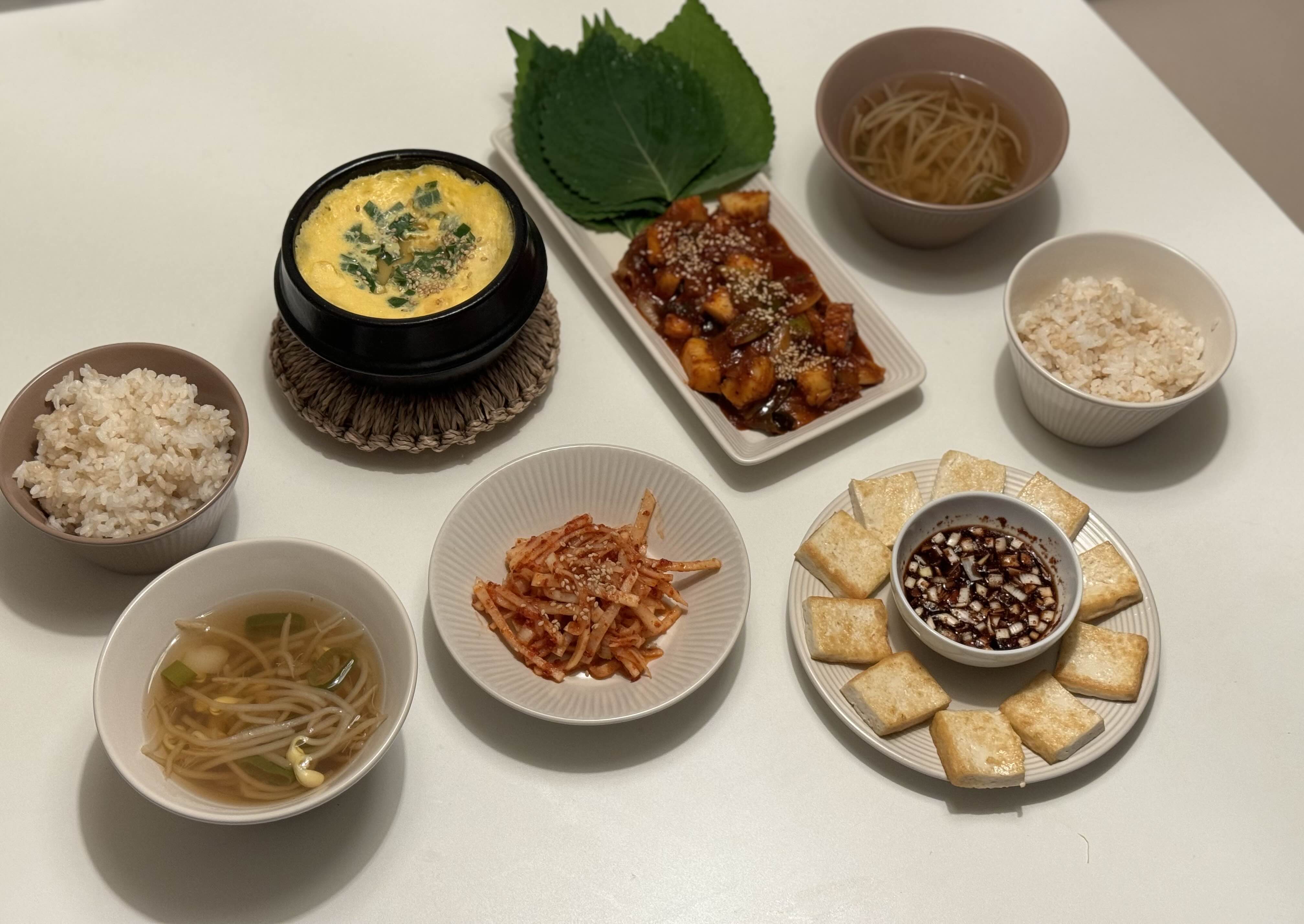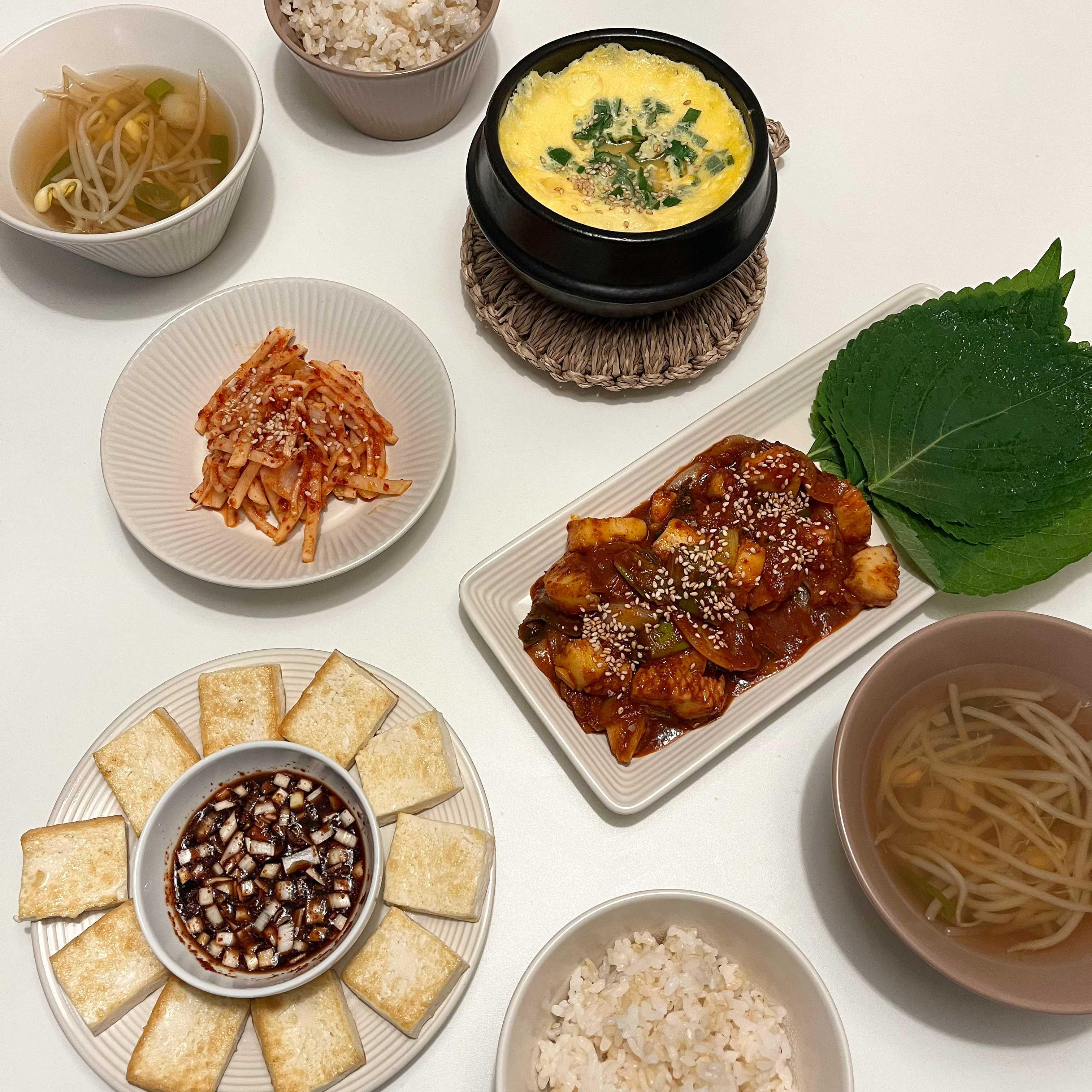 메뉴는 오징어 볶음, 계란찜, 콩나물국, 두부구이, 무생채!