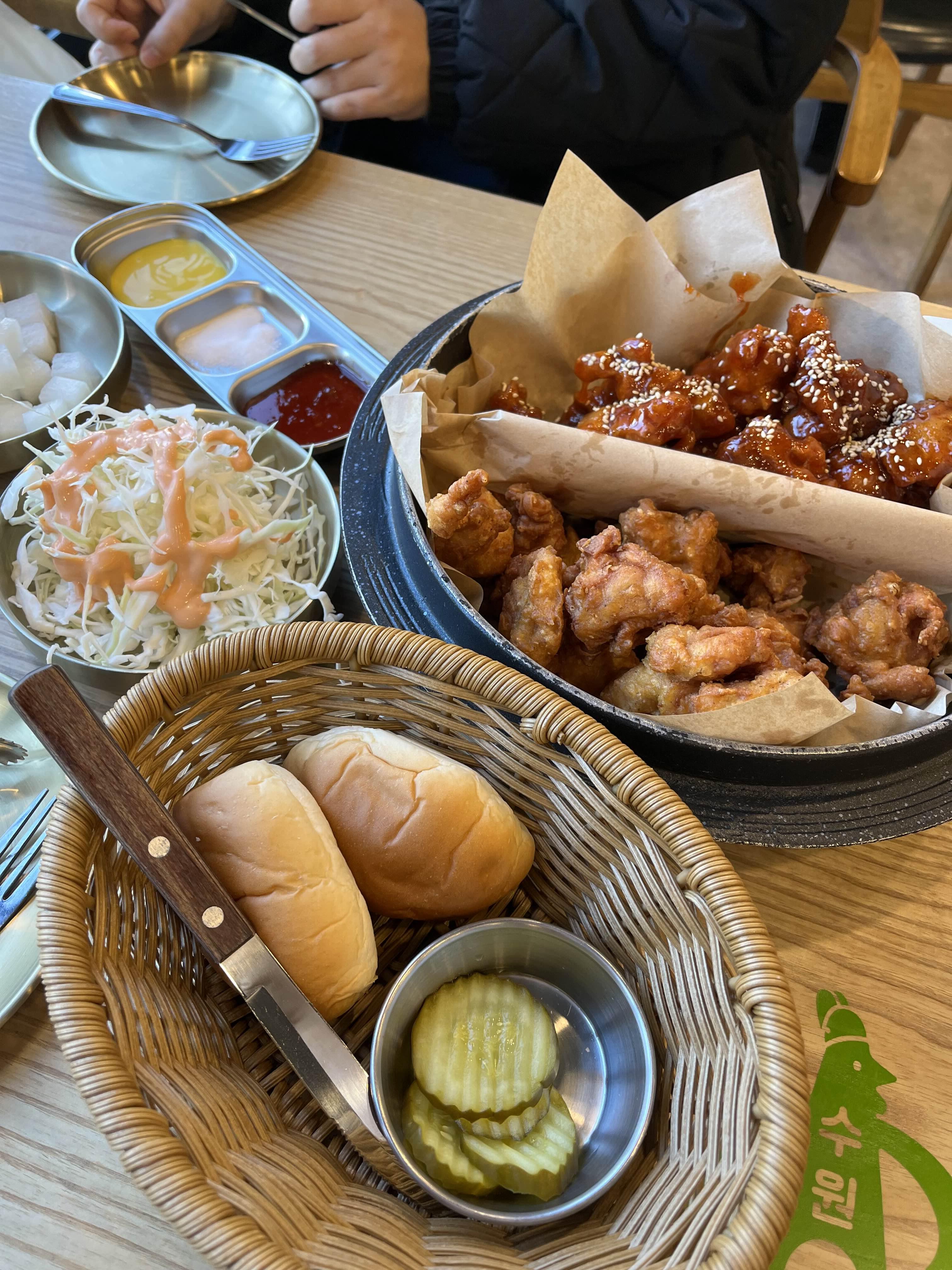양념 치킨을 빵에 끼워 먹는 건데 맛있다.
