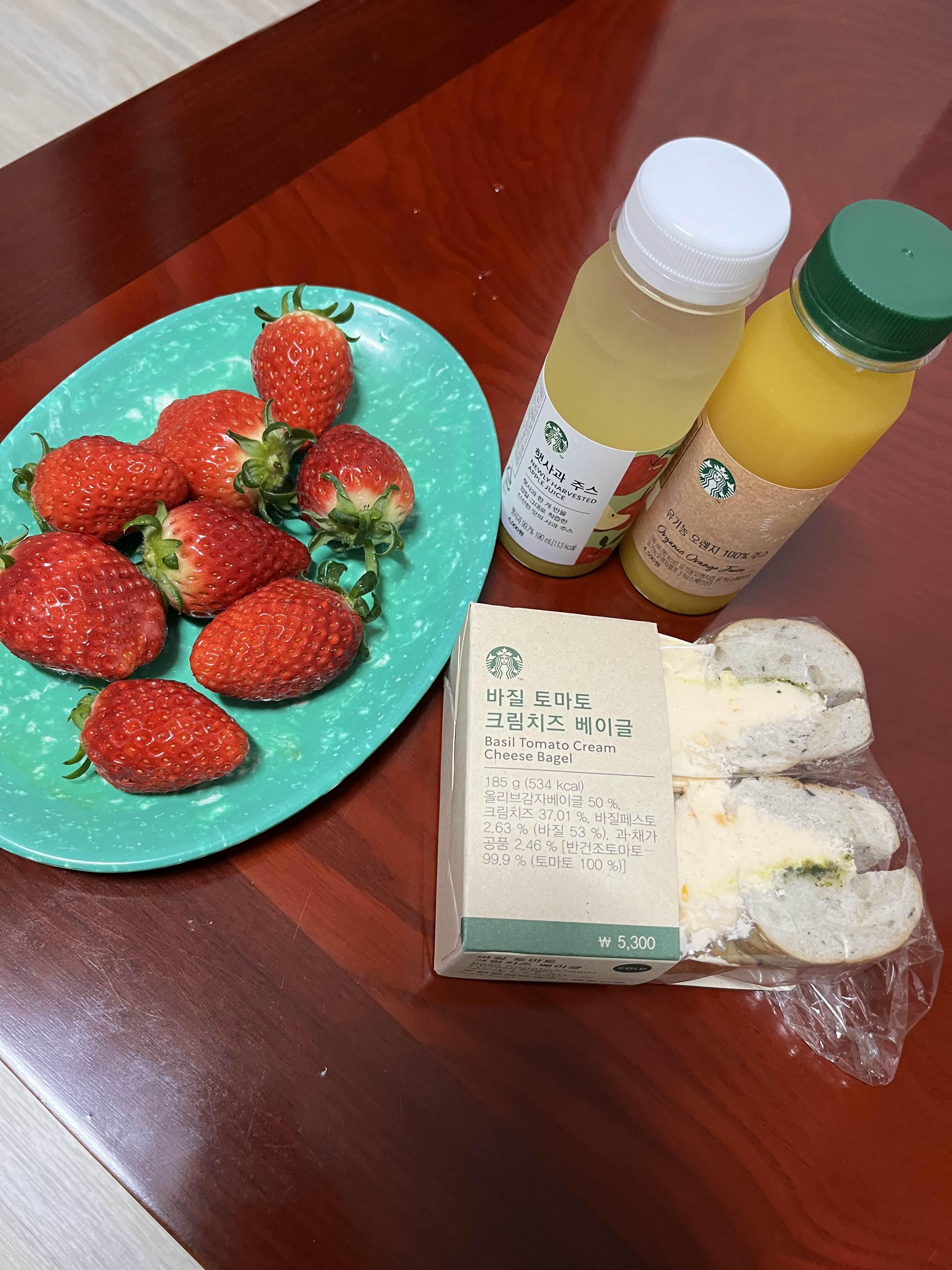 아침에 딸기랑 스벅 바질 토마토 크림치즈 베이글 냠냠.