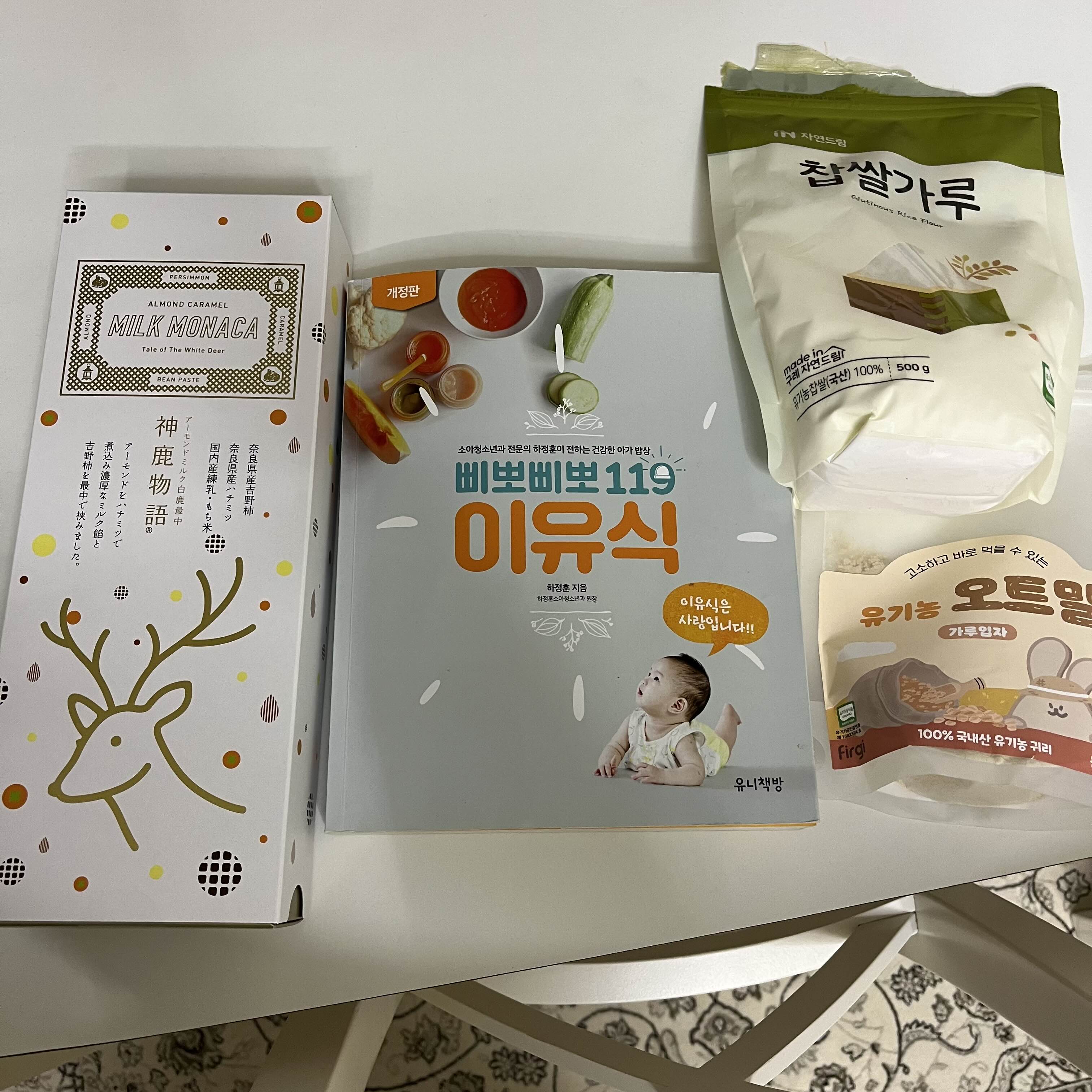 이유식이랑 찹쌀가루, 오트밀. 나중에 오트밀 먹였을 때 아기가 정말 좋아하고 잘 먹었다.