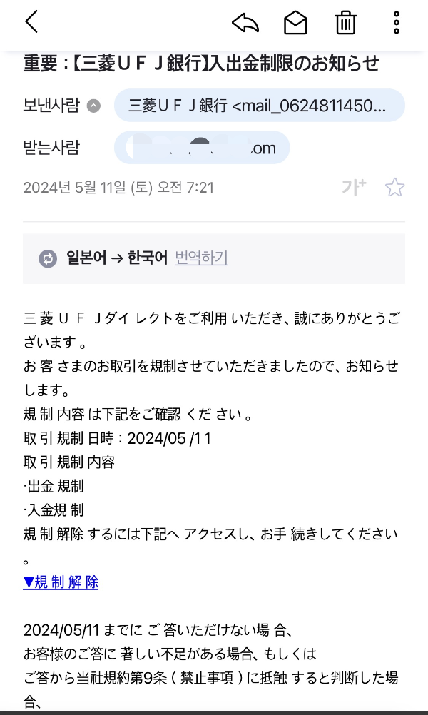 내가 사용하고 있는 미츠비시 UFJ 은행에서 입출금이 제한된다는 메일이 온 것이다.