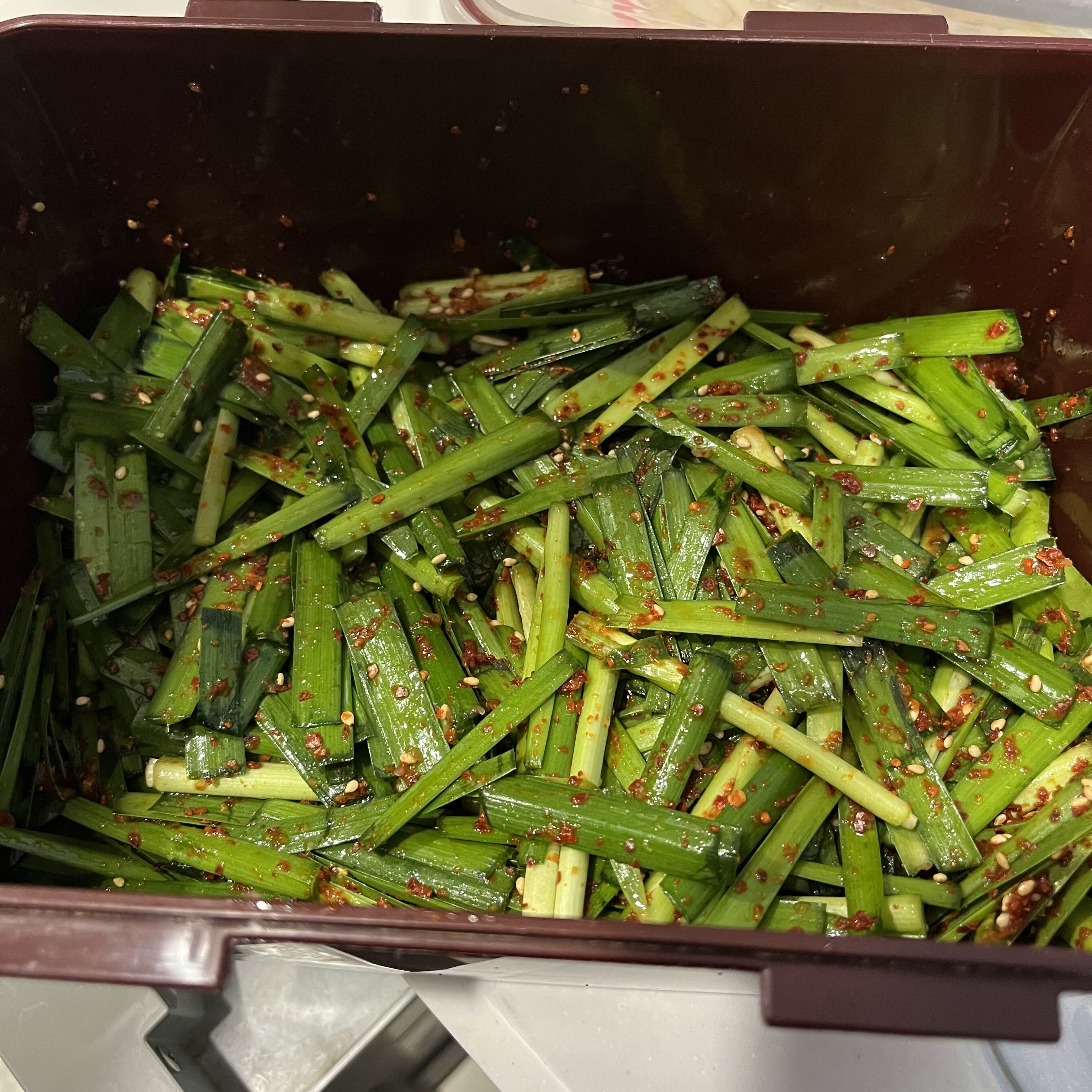 지금 김치를 안시켜먹고 있는데 그 대신 부추를 사다가 부추 김치를 만들었다.