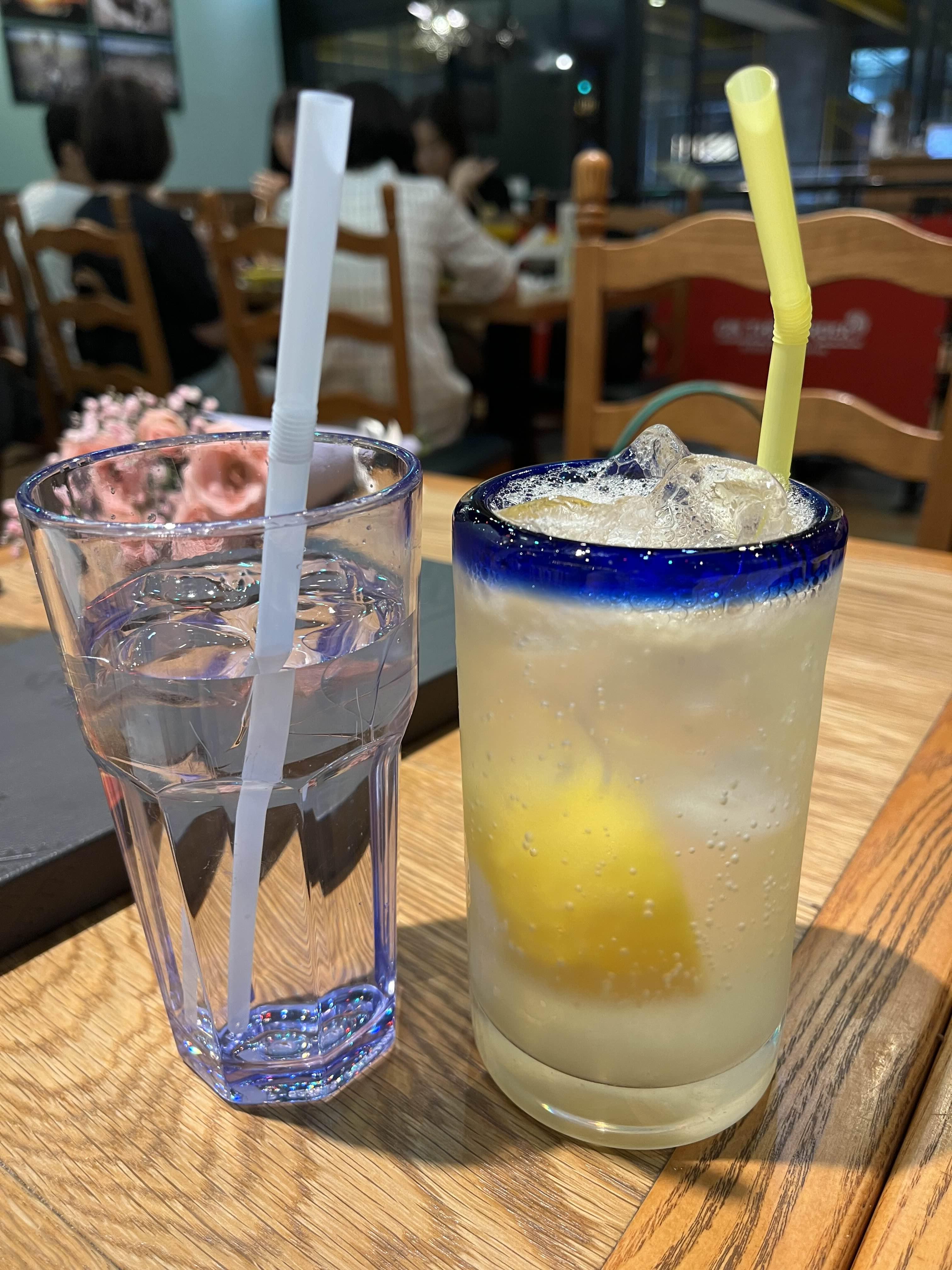나는 레몬 에이드를 시키고 친구는 물을 마셨다.