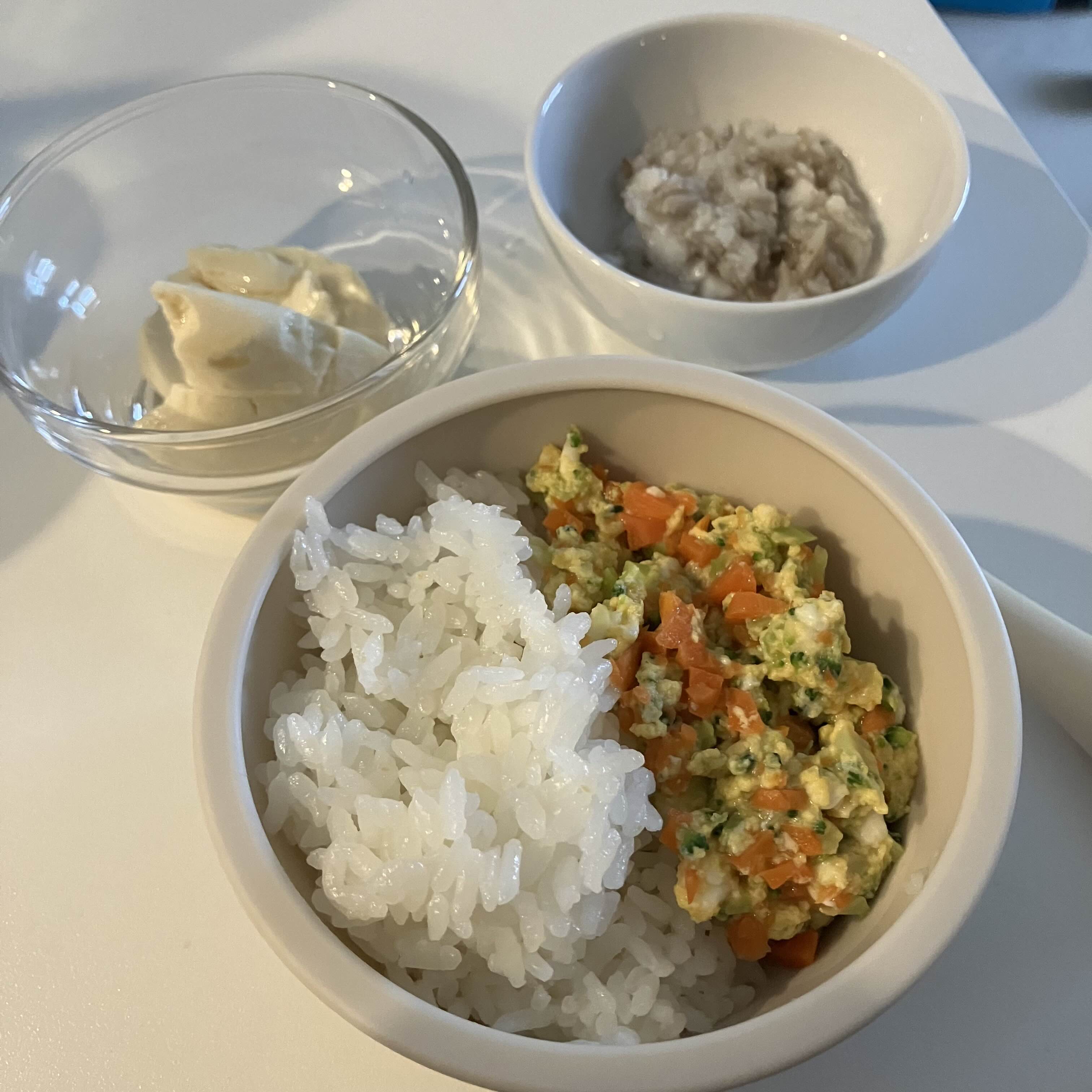 당근이랑 브로콜리 넣은 계란찜과 밥, 두부랑 마 갈은 것