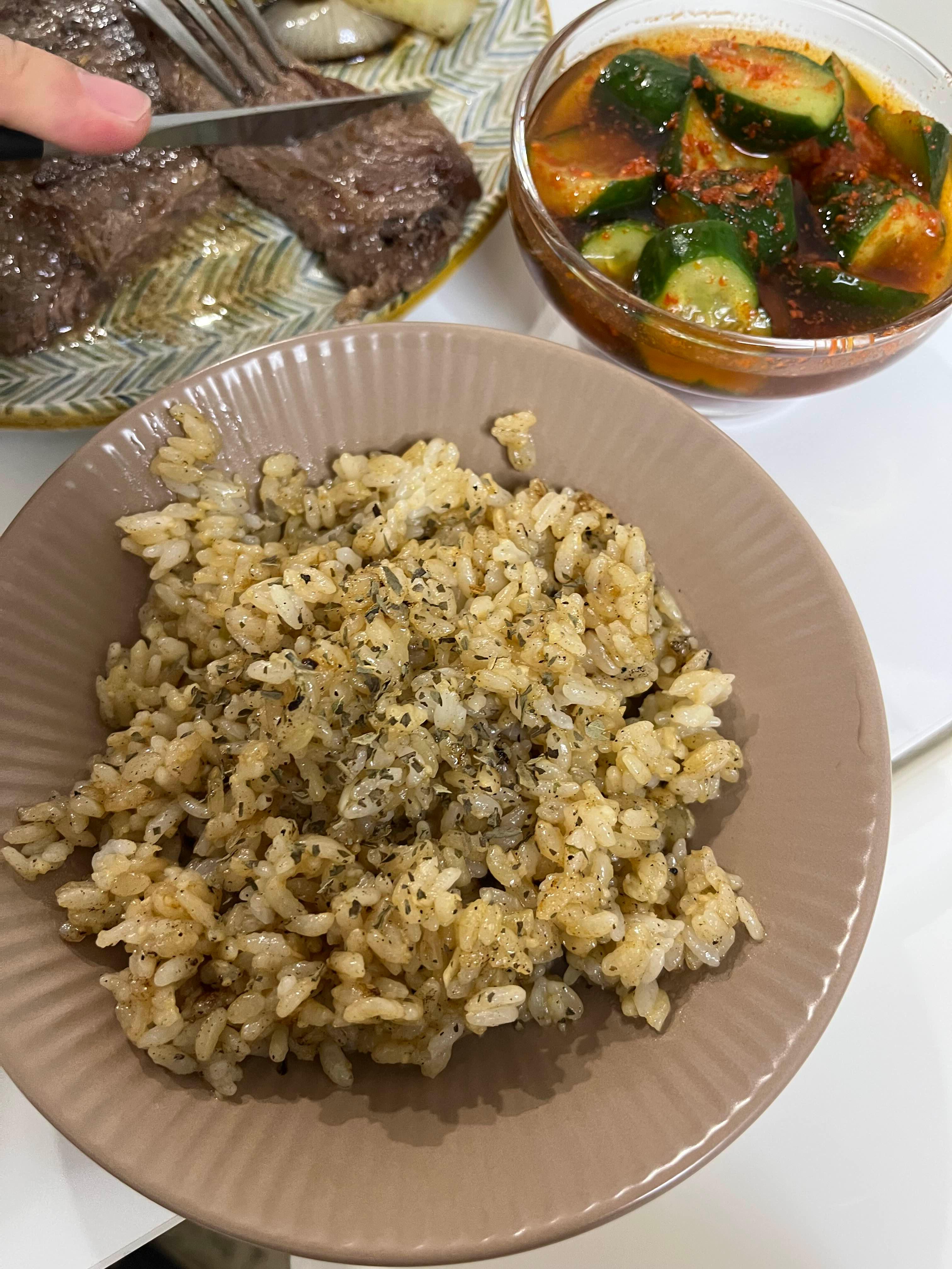 김치찜 해준 거랑 고기 사 와서 스테이크랑 갈릭 볶음밥 해준 것.
