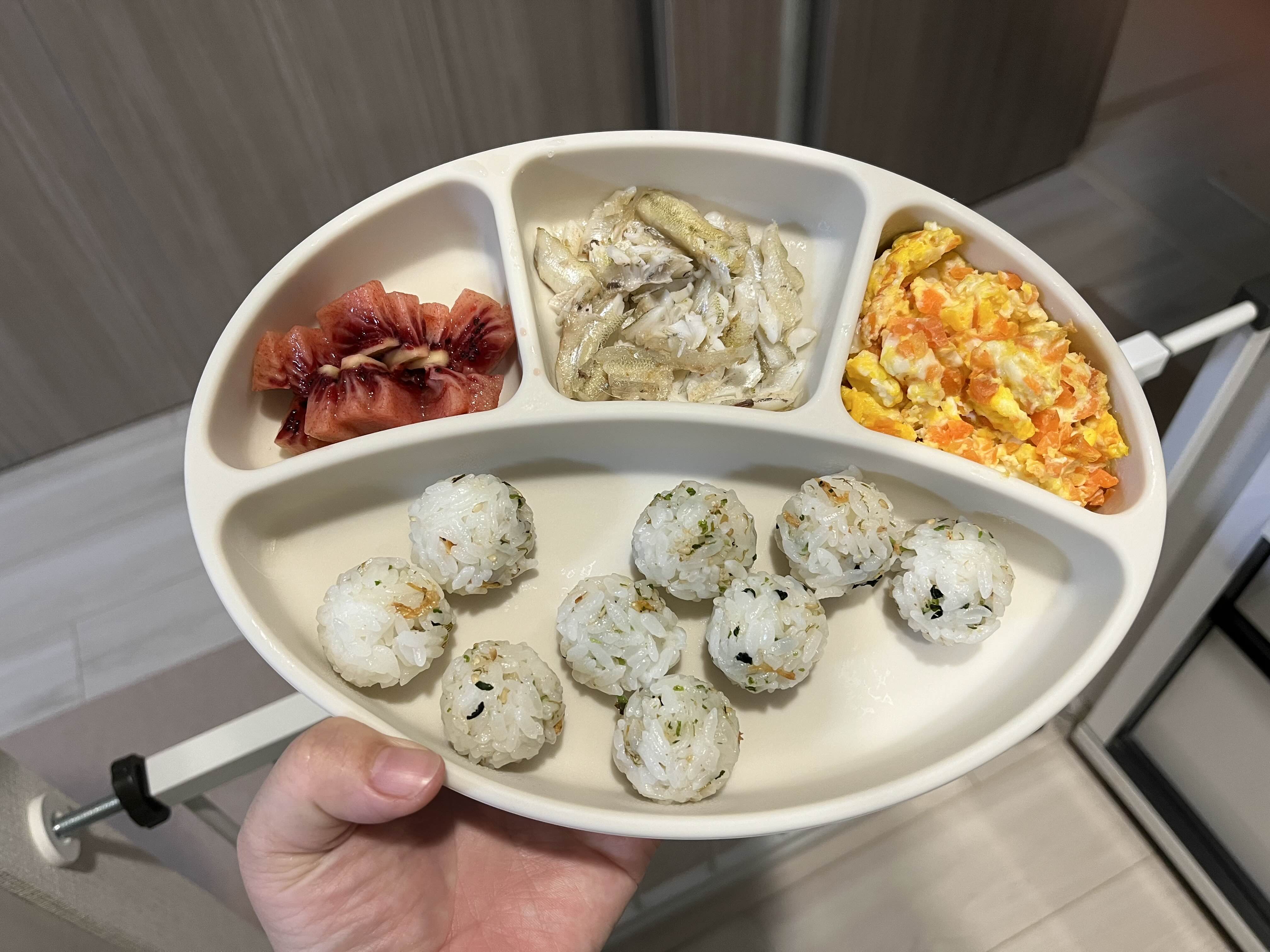 반찬은 아기용 후리카케 뿌려 만든 주먹밥, 당근 계란볶음, 삼치구이, 레드키위
