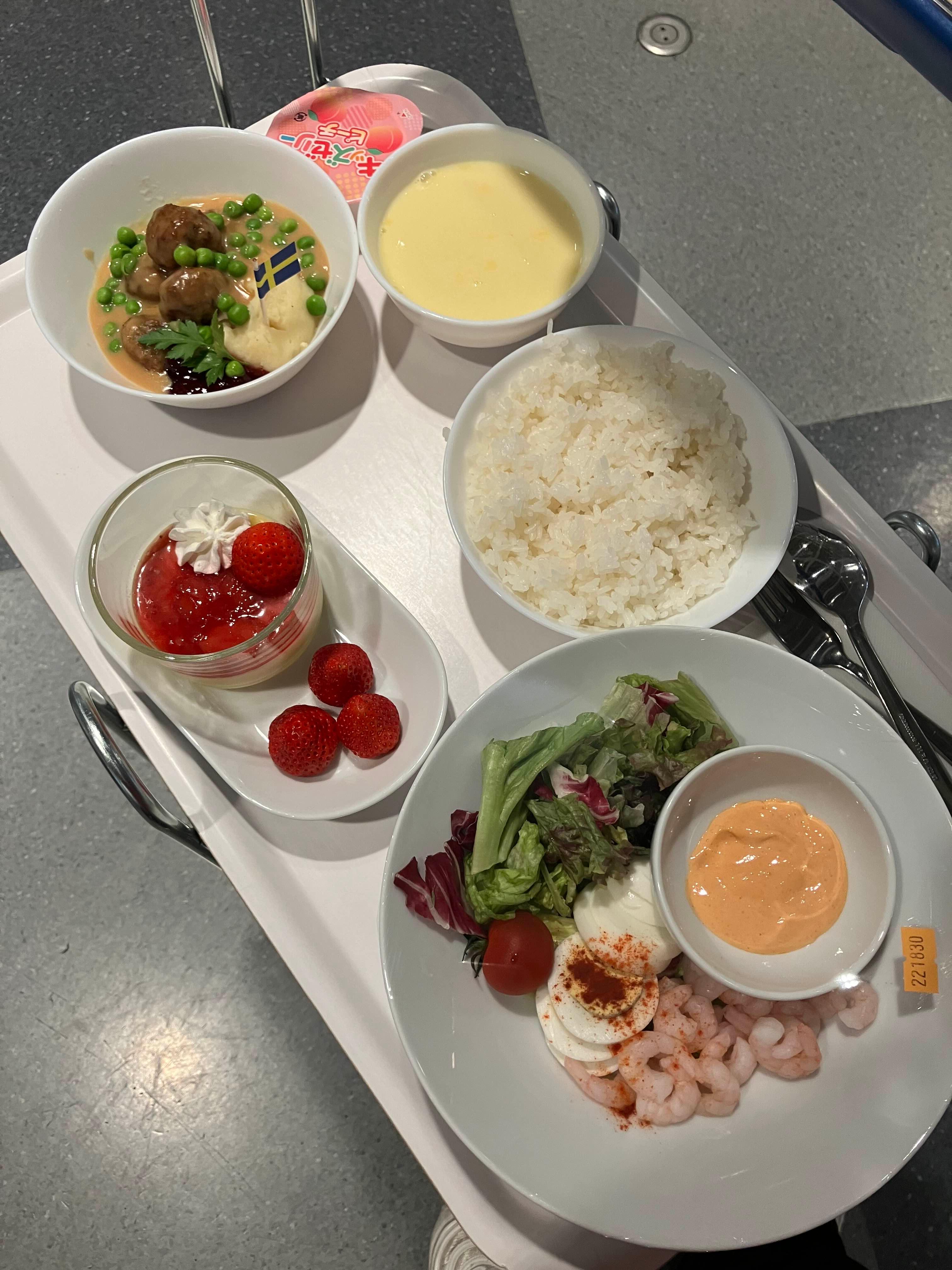 샐러드에 밥, 키즈 미트볼, 스프, 딸기 디저트