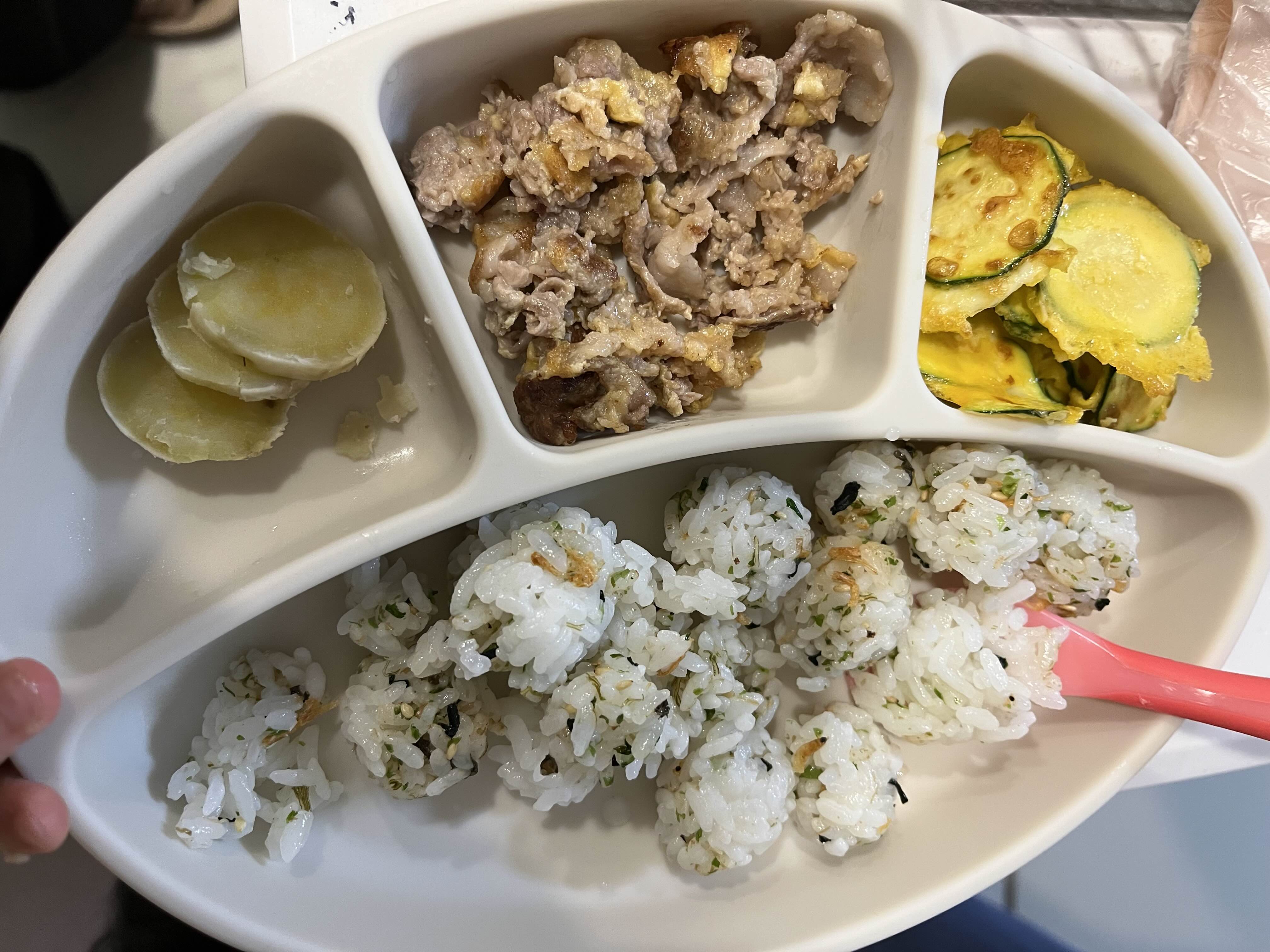 첫번째 사진은 고구마, 아기 육전, 아기 호박전, 후리카케 주먹밥