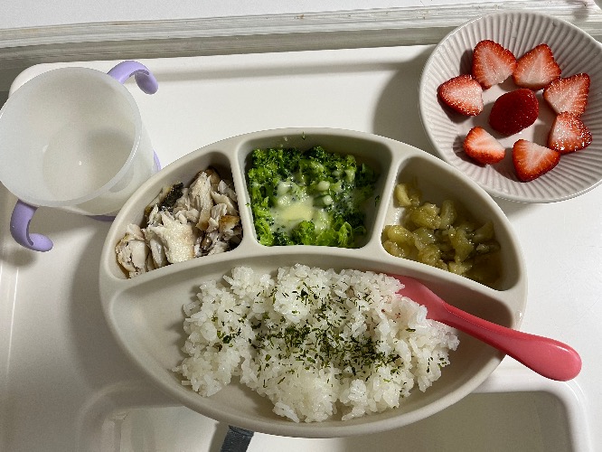 생선구이, 브로콜리 치즈, 가지볶음, 밥, 후식은 딸기