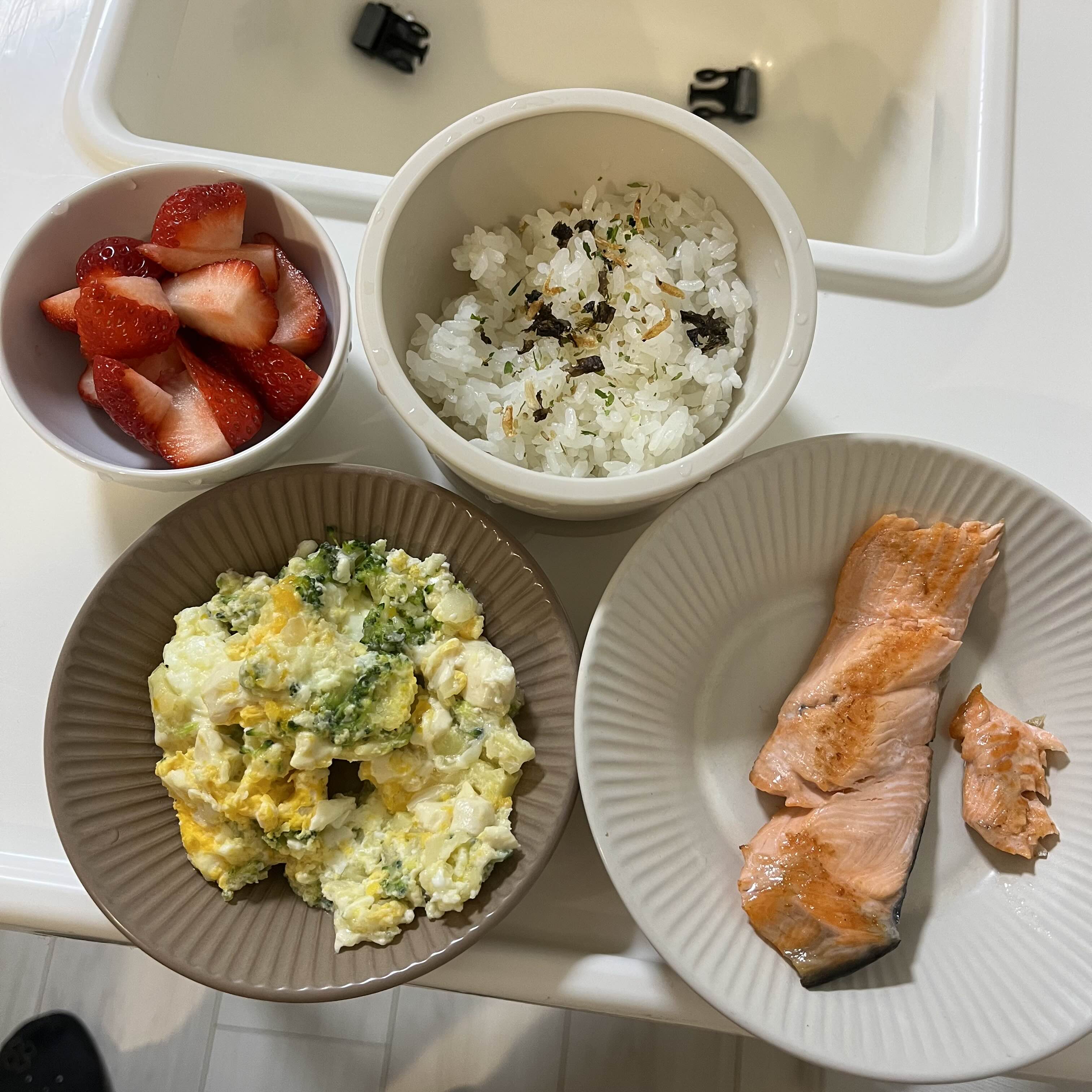 세번재는 밥, 연어구이, 계란 스크램블, 후식은 딸기