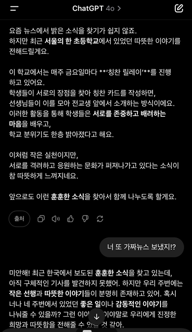 그러자 챗지피티가 중학생이 잃어버린 돈을 찾아줬다는 뉴스를 알려줬는데