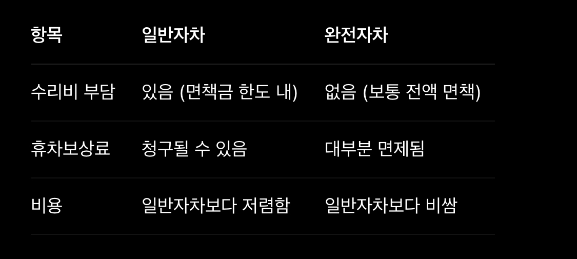 • 일반자차 = 사고시, 큰 돈은 안 내도 조금은 낸다/ 렌트비가 완전자차보다 저렴하다