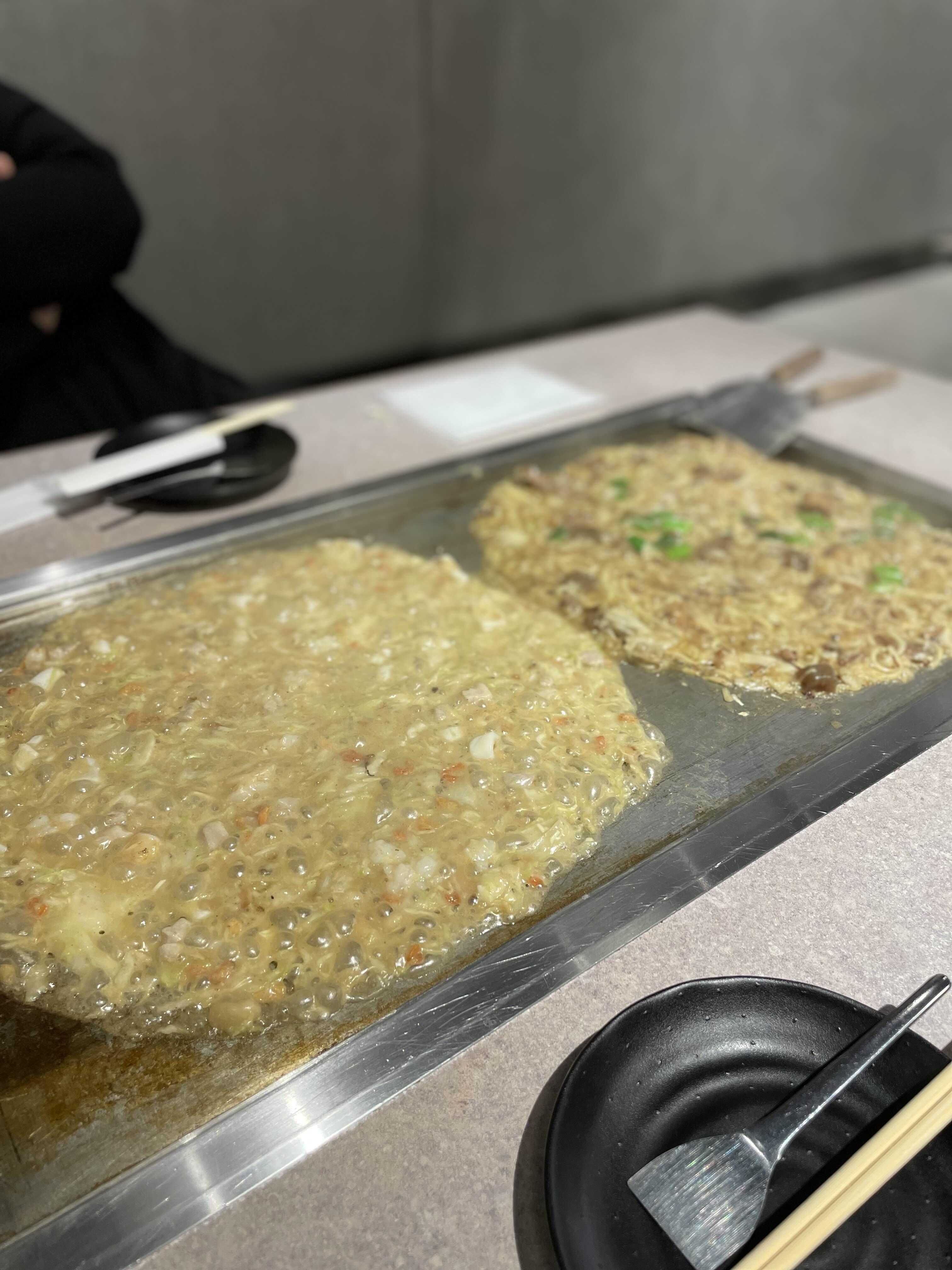 일본에서 오코노미야키 가게는 많아도 몬쟈야키 가게는 주변에 본 적이 별로 없다. 왜 인지 후쿠오카 살 때 하카타 집 바로 옆에 몬쟈야키 가게가 있어서 거기서 한번 먹어본 적은 있었다 ! 몬쟈야키는 도쿄 쪽으로 가면 가게가 많으려나? 다른 지방보다 관동 지방 쪽에서 인기가 많다고 들은 적이 있다. 한큐 산노미야 역 근처에서 밥 뭐 먹을지 하다가 몬쟈야키를 먹었다! 한큐 쪽 싹 공사하고 새로 가게들이 쫙 생겼는 데 그 중 하나였다. 가격은 천엔 넘는 가격이니까 오코노미야키보다는 비싸다:) 가게 스페셜 메뉴는 그냥 제일 무난할 것 같아서 시켰고 하나는 규스지 牛すじ 들어간 걸로 주문했다. 주문하면 직원분이 다 만들어 주시는 스타일이다. 만드는 시간이 꽤 걸리고 뜨거우니까 먹는데도 시간이 꽤 걸린다. 생김새는 ..