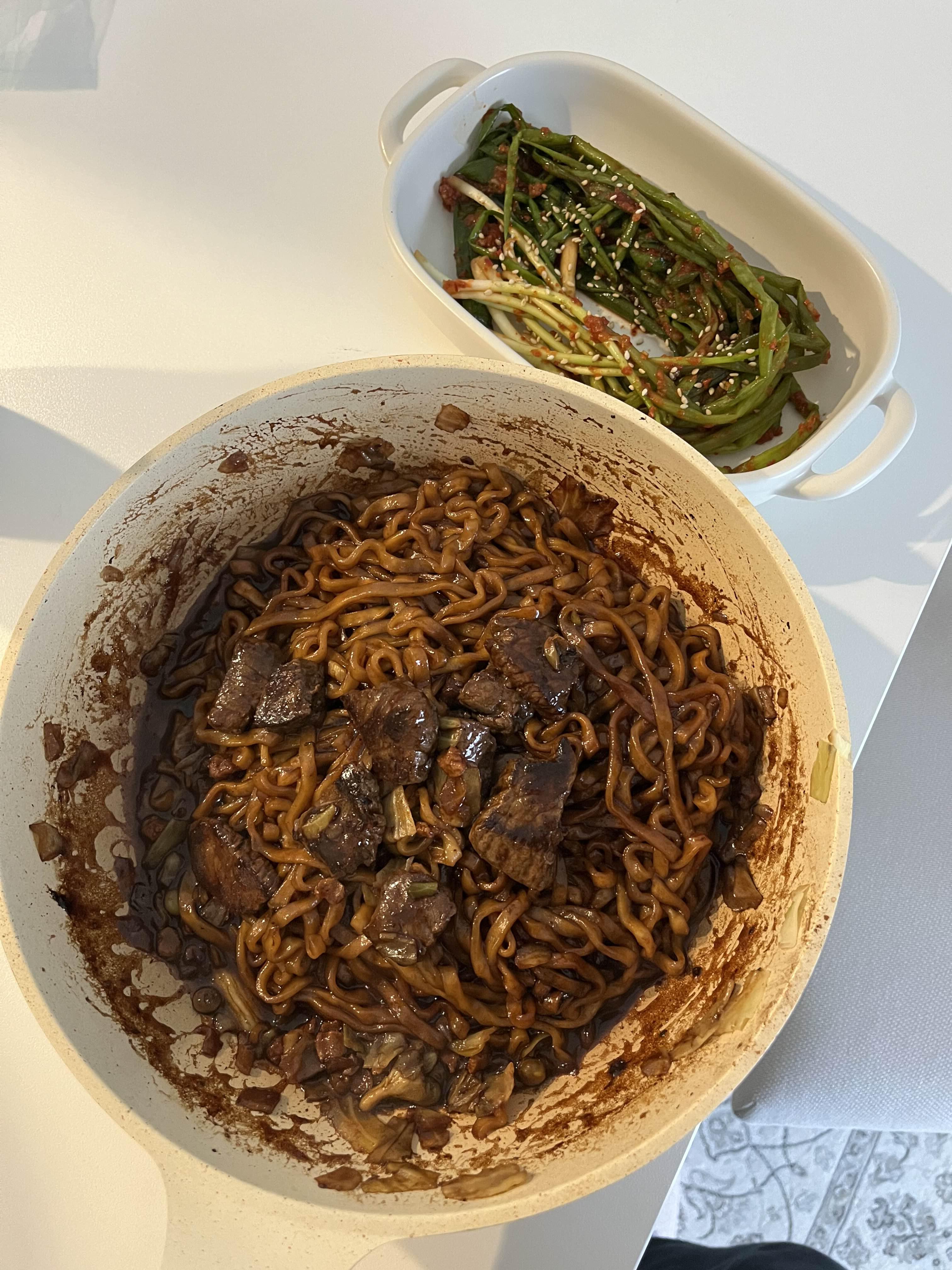 짜왕에 아기 이유식 만들고 남은 소고기 넣어서 ㅋㅋ 파김치랑 같이 먹었다.
